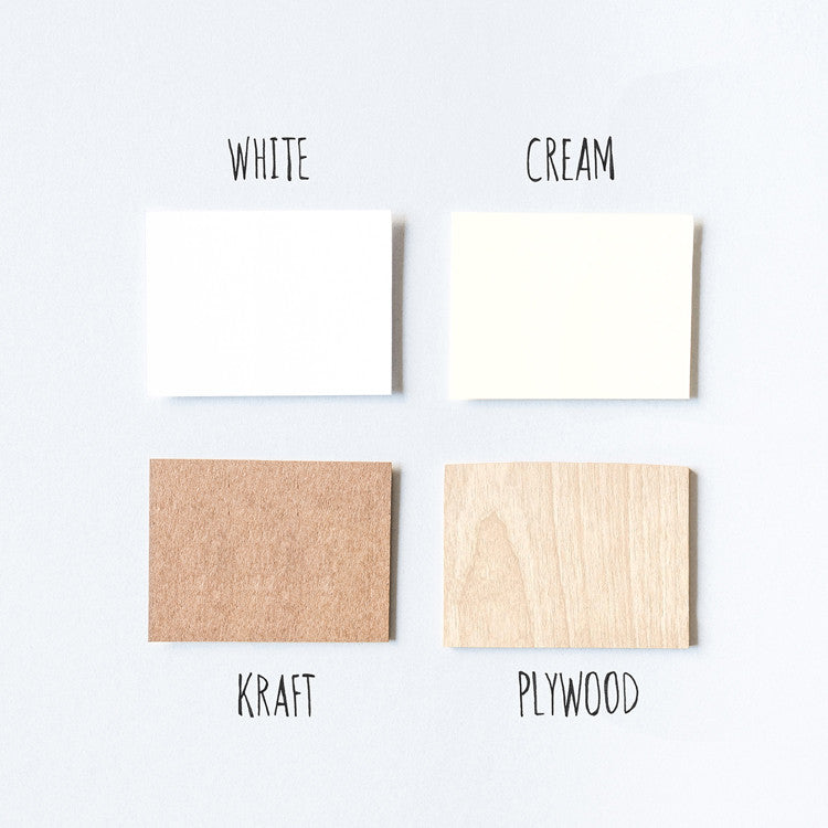 Our card stock is thick and sturdy and comes in white, cream and kraft (rustic brown). You can upgrade to a wooden swing tag which is cut from 3mm plywood, with the design etched by laser. The additional cost for the wooden swing tag is $1.50/ea.